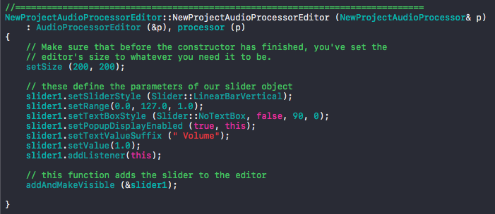 1 2 3 4 5 | MyPluginEditor::~MyApAudioProcessorEditor() { slider1.removeListener (this); } |
