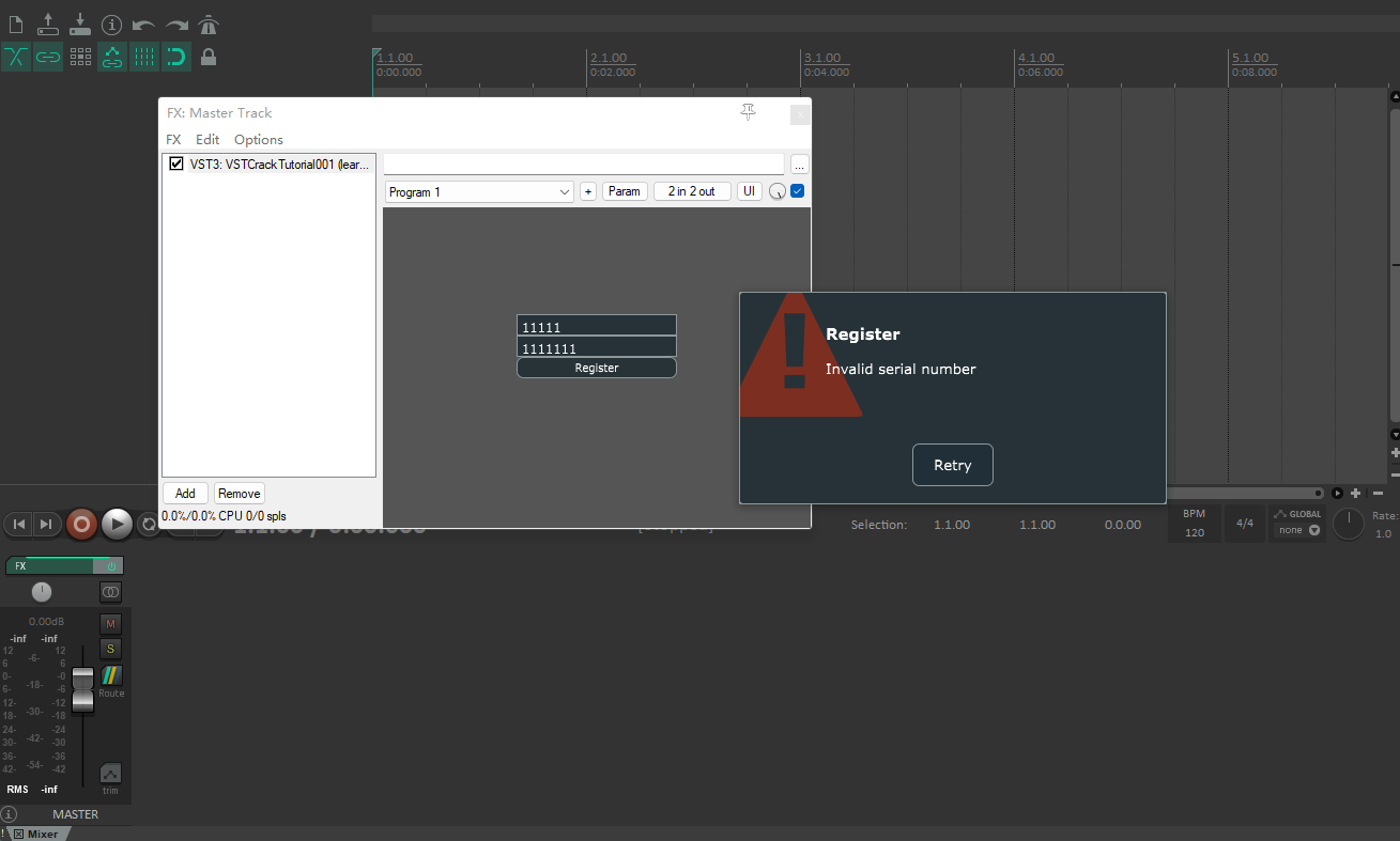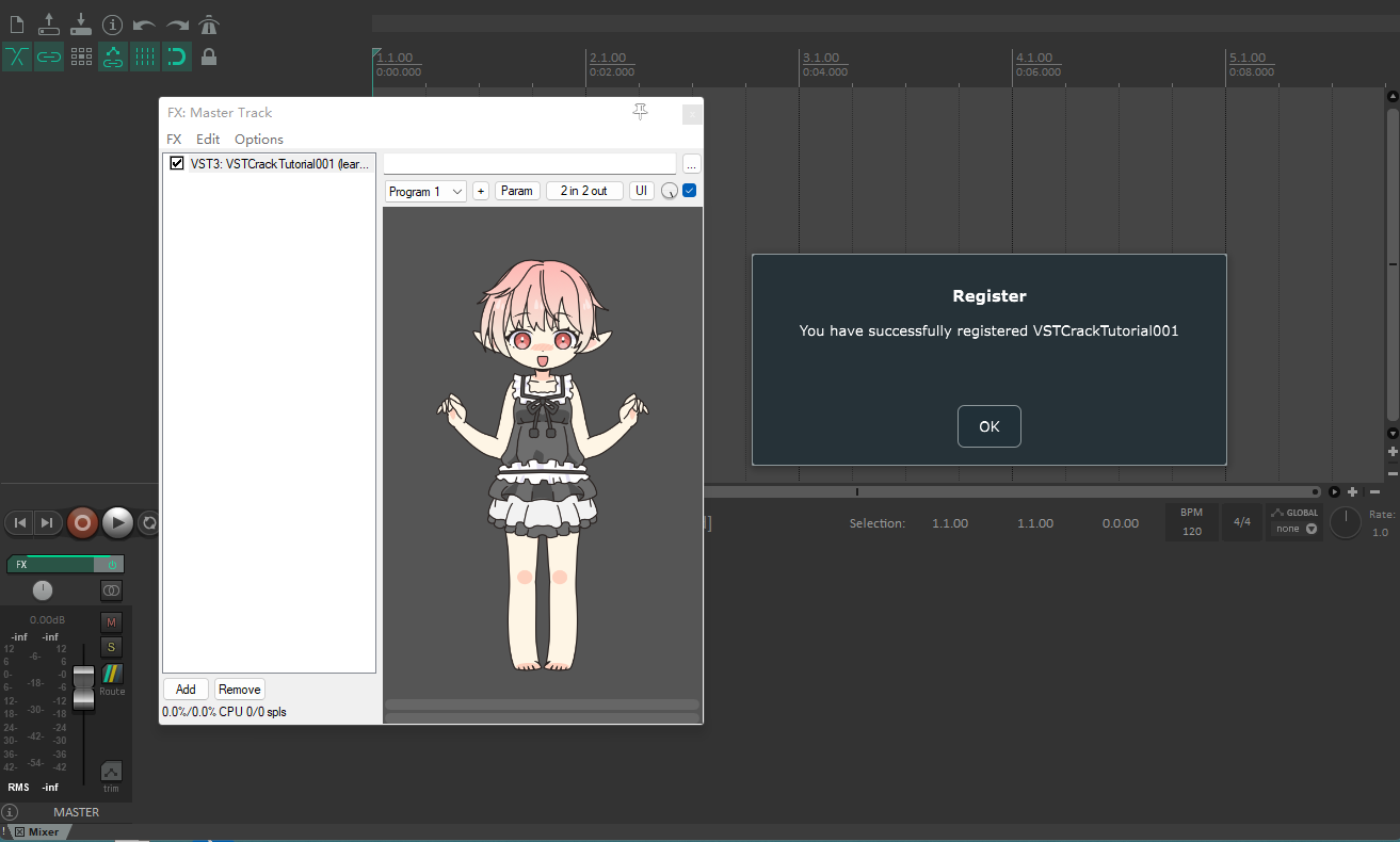 记住正确会弹出 “You have successfully registered VSTCrackTutorials001” 的提示,后面会用到