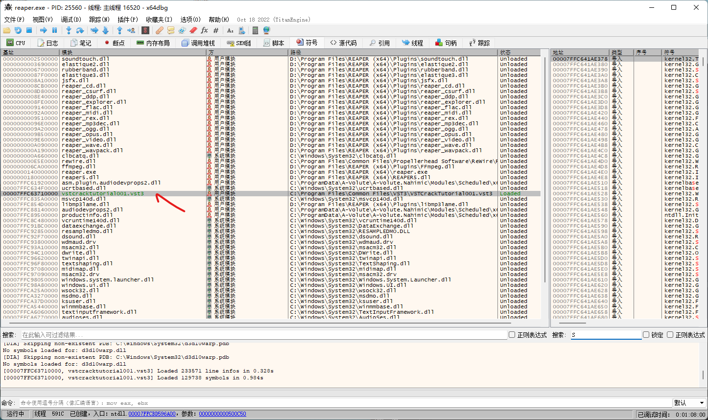 找到加载的 “vstcracktutorial001.vst3” 模块 (是一个状态为 Loaded 的 用户模块),双击
