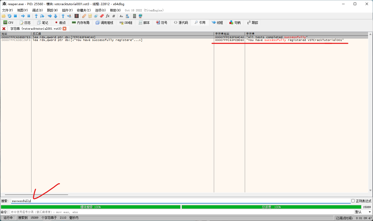 等待底部搜索进度条拉满后,在进度条上方的搜索框里搜索 “You have successfully registered VSTCrackTutorials001″(前面提到的 注册成功 弹出的信息) 里的内容