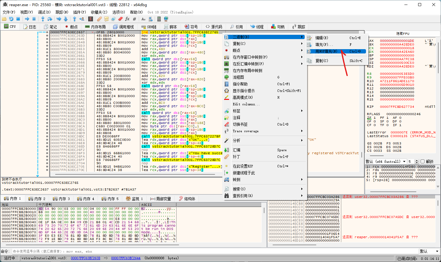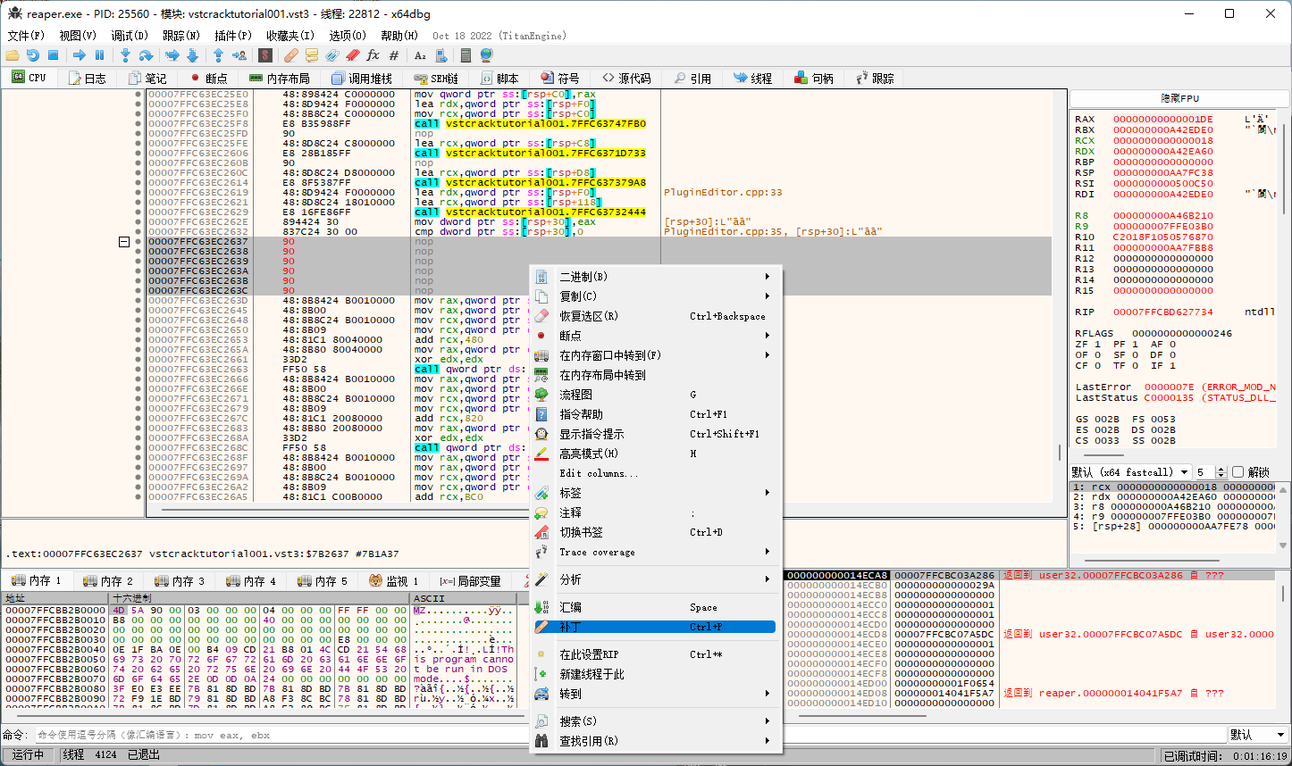 在反汇编窗口(CPU标签页)点击 右键 -> 补丁