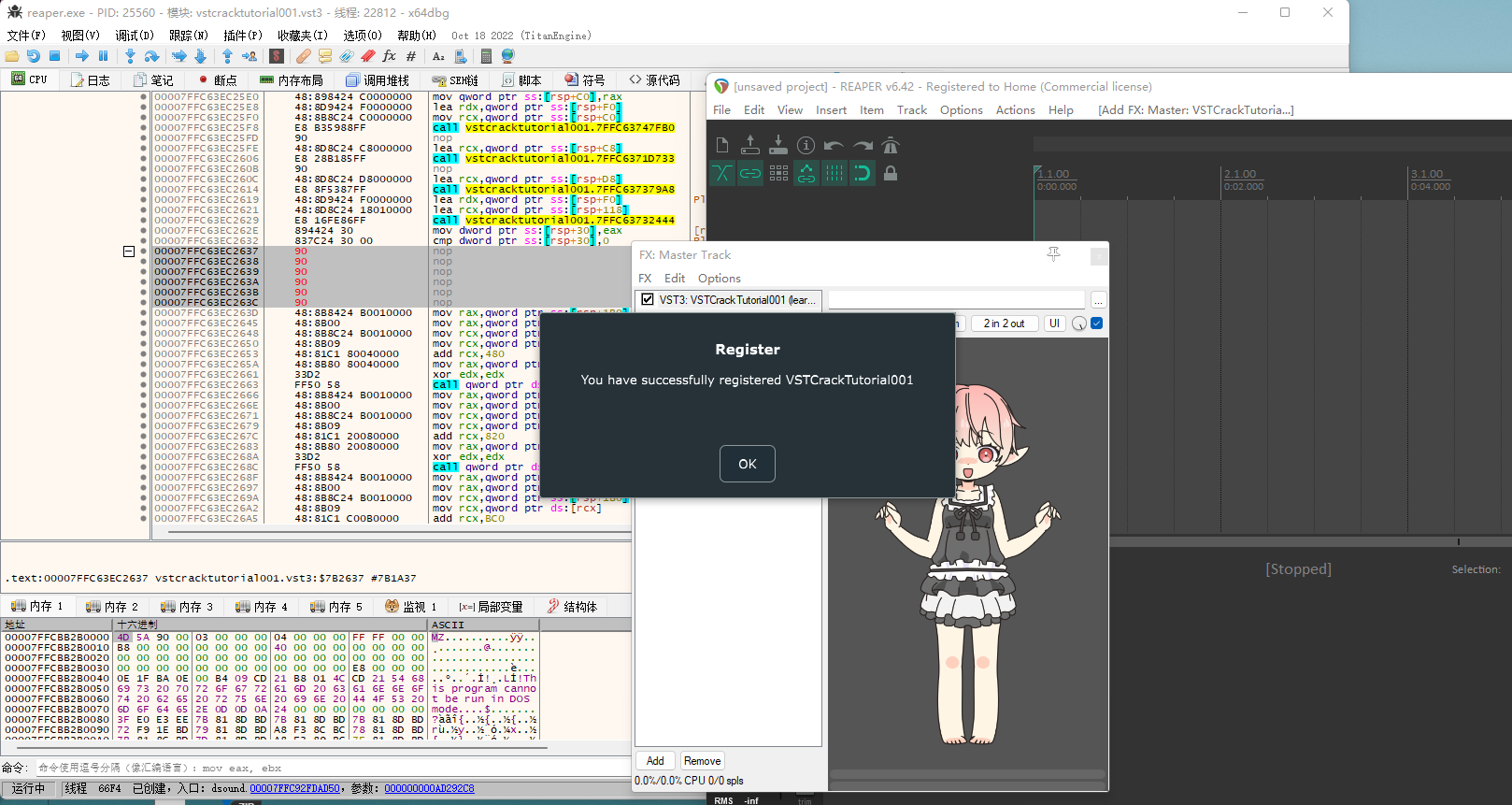 音频插件,本质是挂载在一个应用程序(宿主DAW)上的模块,而Cracking要做的事,则是通过调试工具找到并反汇编这个模块,进而分析修改并重新转存这个模块