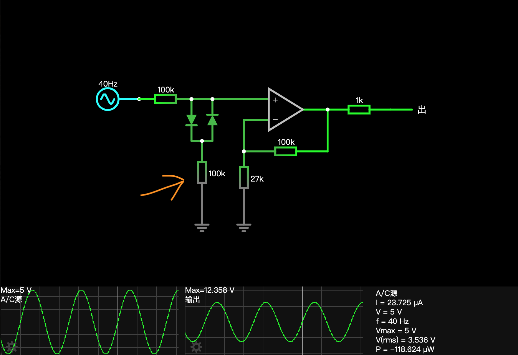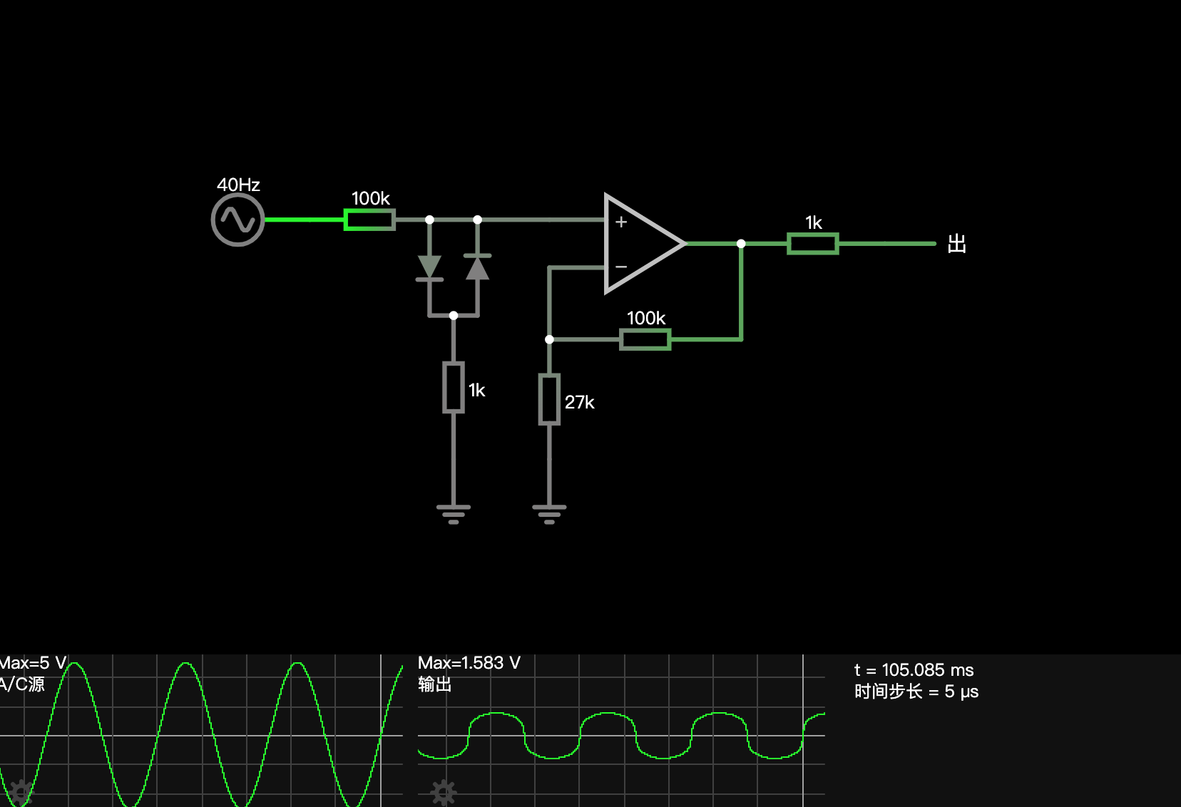 这个电路中制造硬件感的地方是左半部分的二极管(右半部分是放大)