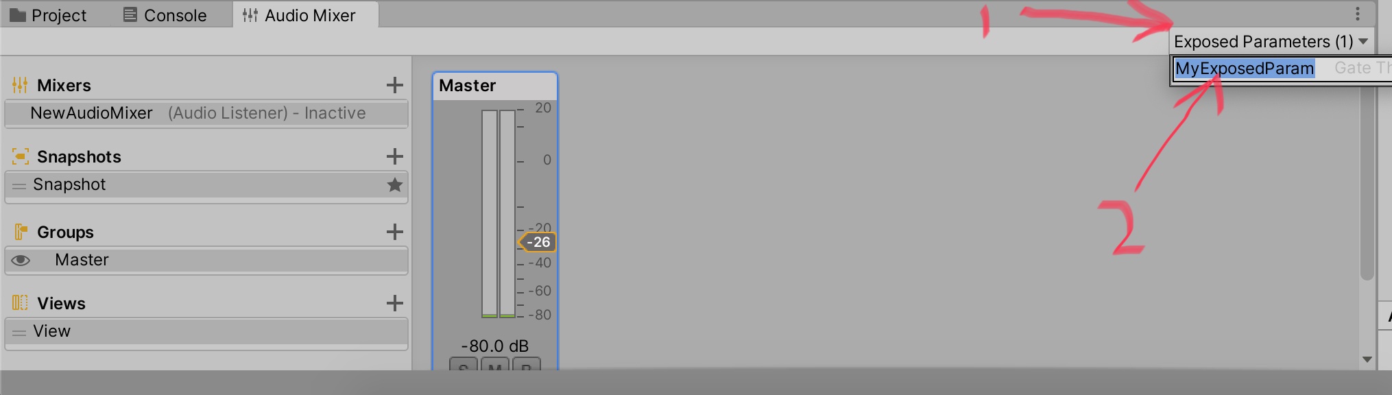 然后就可以在脚本中通过 你的audioMixer.SetFloat(“暴露给脚本的参数名”,要设定的值) 交互了